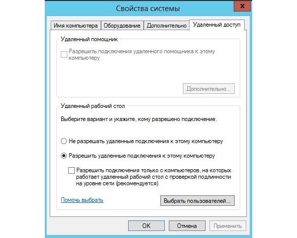 4) В открывшихся свойствах системы (рисунок 30) поставьте флажок на «Разрешить удаленные подключения к этому компьютеру» и уберите галочку с «Разрешить подключение только с компьютеров, на которых работает удаленный рабочий стол с проверкой подлинности на уровне сети»; 5) Примените изменения.