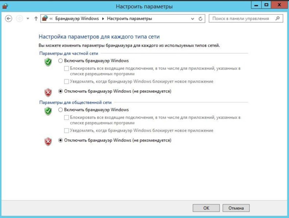 6) Поставьте флажки на «Отключить брандмауэр Windows» (рис. 33);