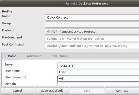 5) Ниже выберите вкладку Basic. В поле Server введите ip адрес сервера, в поле User name – логин пользователя Windows, под которого хотите зайти. В поле User password – пароль этого пользователя;