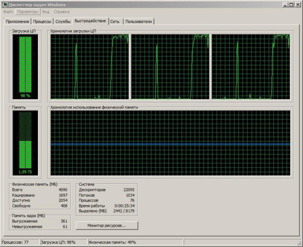 На рисунке 59 показан скриншот из Диспетчера задач атакованного сервера. Видно, что сервер испытал большую нагрузку во время расчетов.