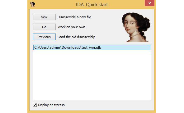 После запуска IDA предлагает 3 варианта продолжения: дизассемблировать новый файл (new), продолжить без загрузки файла (go), открыть ранее дизассемблированный файл (previous). Скриншот окна представлен на рисунке 60.
