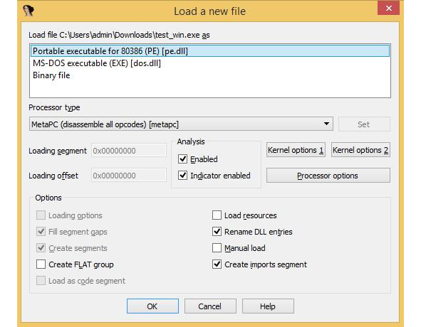 Выберем дизассемблирование нового файла. Загрузим на анализ любой exe. Далее появится окно, изображённое на рисунке 61.