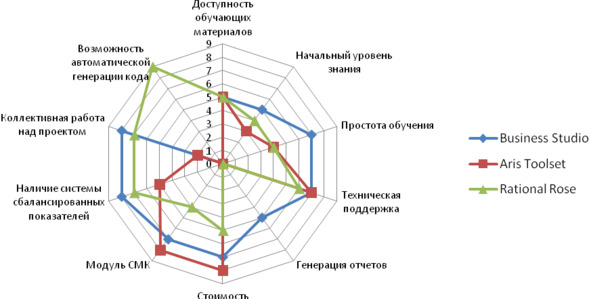 На рисунке 4 показано сравнение Business Studio, Aris Toolset и Rational Rose.