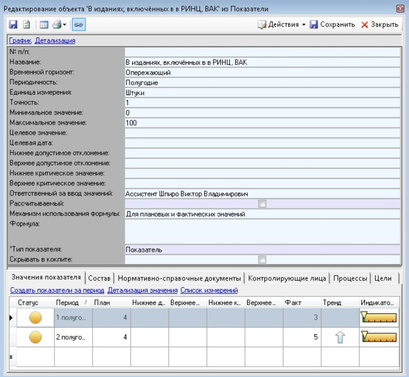Для осуществления достижения поставленных целей процессов в систему занесены ключевые показатели эффективности (KPI). В тестовом режиме пока на примере одного факультета (рисунок 12)).