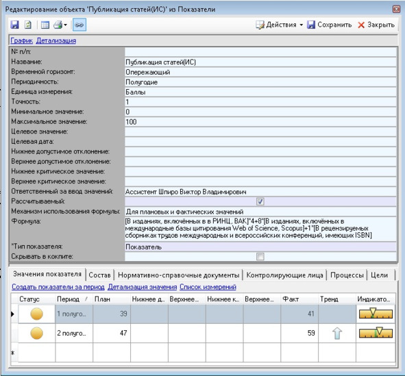 При соответствующих правах доступа, ответственный за ввод значений может заполнить фактическое выполнение, и, с помощью индикатора, отслеживать выполнение или невыполнение плановых значений. Для расчета рейтинга преподавателя введены формулы для расчета итоговых значений (рисунок 15).