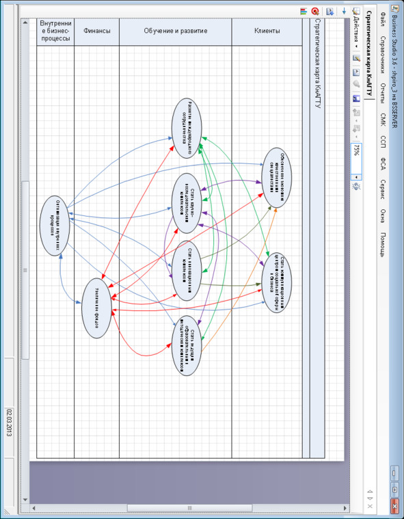 В Business Studio описана организационная структура университета (рисунок 2), а также выделены плоскости BSC-карты: клиенты, обучение и развитие, финансы, внутренние бизнес-процессы. Было проведено распределение целей по плоскостям стратегической карты, что отображено на рисунке 3.