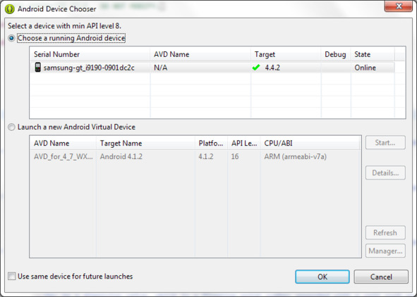 Нажимаем Ok. После этого появится окно, где вы можете выбрать на каком устройстве выполнить запуск. В верхнем листе записаны все реальные устройства подключенные к ПК и настроенные должным образом (включена отладка на устройстве), в нижнем листе – все виртуальные устройства, созданные вами. Вы можете выбрать любое и нажать на запуск.
