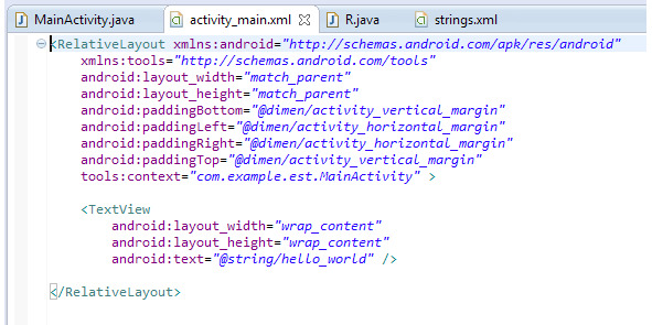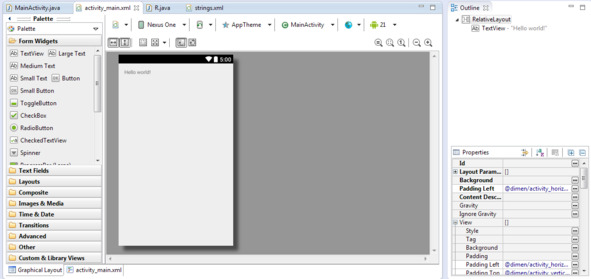 Справа в верхнем углу видим логическую структуру нашего слоя, давайте разберемся с этим подробнее. И так наш layout-файл имеет корневой слой RelativeLaoyt (один из видов слоев), в данном случаем слой является элементом ViewGroup. Стоит понимать разницу между layout-файлом (файлом разметки) и layout (слоем). Первое это наш экран, вторым можно назвать View-элемент, хотя это не совсем так, как было сказано layout (слой) – это элемент ViewGroup. Любой layout-файл имеет свой корневой слой, в этом слое хранятся дочерние элементы, согласно правилам этого слоя. При создании проекта у нас уже добавился автоматически дочерний View – TextView с надписью: «Hello world».