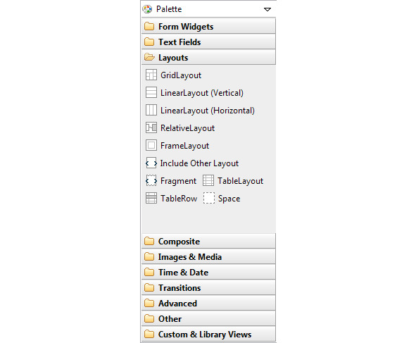 Как вы уже, наверное, в наборе View, расположенной слева, есть иерархия Layouts.