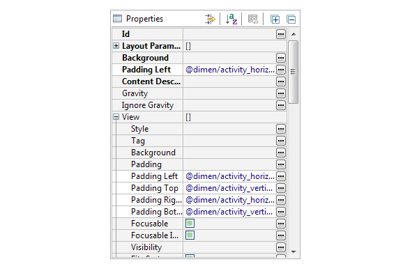 Во-первых: это окно свойств View-элемента. Для начала выделим элемент, свойства которого мы хотим поменять, и в правом нижним углу появится панель.