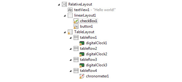 И так самый главный у нас корневой слой RelativeLayout. В нем текстовый элемент, который среда создала автоматически. Далее мы добавил еще один слой LinearLayout, он обладает такими свойства, что элементы расположены по вертикале (существует такой же только элементы будут располагаться горизонтально), в него мы добавил пару элементов. Потом был добавлен слой TableLayout поверх корневого слоя, в нем дочерние элементы являются слои TableRow (элементы в нем расположены по горизонтали и растянуты по всей ширине). В каждый TableRow мы добавил еще по одному элементу.
