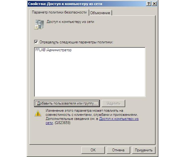 Согласно заданию, нужно настроить систему так, чтобы только локальной группе администраторов был разрешен доступ к этому компьютеру по сети. Определим параметры политики как на рисунке 6.3.