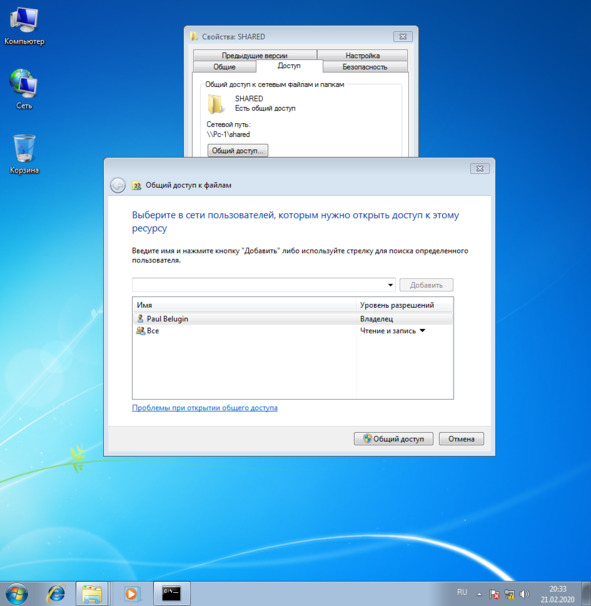 На данном компьютере создадим общую папку с название SHARED и дадим общий доступ для всех (рисунок 6.5).