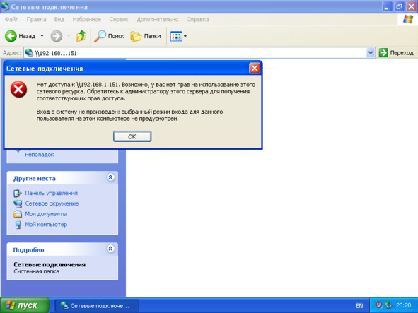 Рисунок 6.7 – Ошибка доступа к общей папке