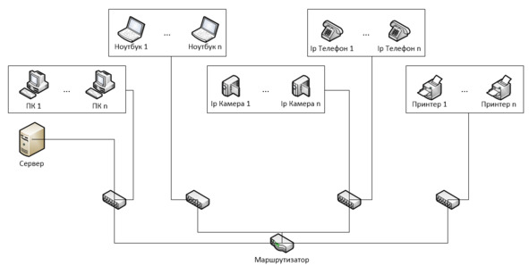 Приведем пример организации с упрощенной архитектурой сети на 100 ip-адресов. На рисунке представлена топология сети, включающая в себя: сетевые принтеры, ip-телефоны, ip-камеры, сервер, компьютеры, ноутбуки и соединяющие их коммутаторы, и маршрутизаторы (см. рисунок 7.1). Ip-адрес имеют только устройство работающие на сетевом уровне модели OSI, поэтому возможность сканирования коммутаторов отсутствует. Решить проблему поможет виртуальный интерфейс коммутатора – SVI. Маршрутизаторы в свою очередь имеют несколько интерфейсов, работающих на сетевом уровне, поэтому в данном случае это устройство имеет 5 ip-адресов