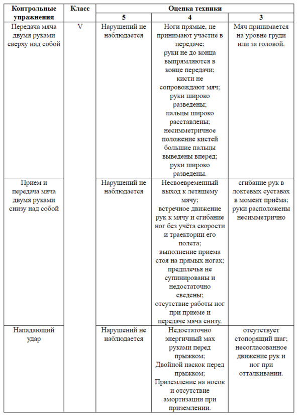 Таблица 1.1 – критерии оценки уровня техники выполнения контрольных упражнений по волейболу