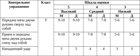 Критерии уровня освоения технических элементов представляют соответствие результатов контрольных упражнений запланированным. В зачет идут попытки, выполненные без нарушений основ техники выполнения волейбольных элементов (таблица 1.1).