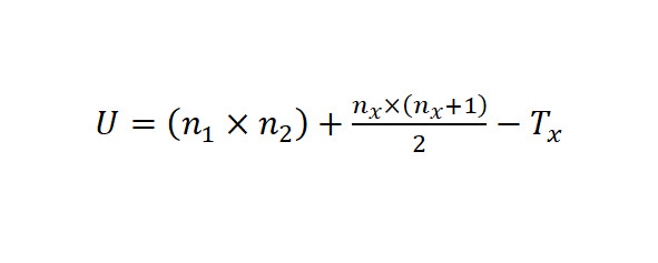 Подсчитать отдельно сумму рангов, пришедшихся на долю элементов первой выборки R1, и отдельно – на долю элементов второй выборки R2, затем вычислить: для проверки подсчета ранжирования нужно U1+U2=n1*n2.
