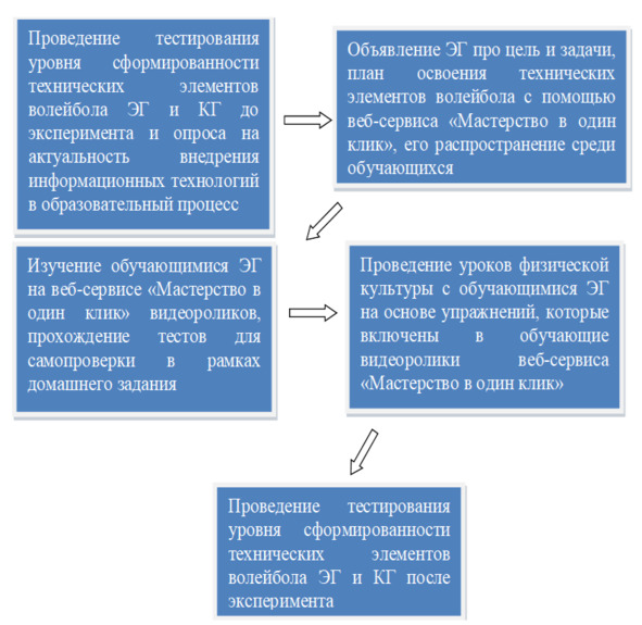 Рисунок 1.7 – Технологическая карта внедрения веб-сервиса для освоения основных элементов волейбола «Мастерство в один клик» в образовательный процесс по предмету «Физическая культура»