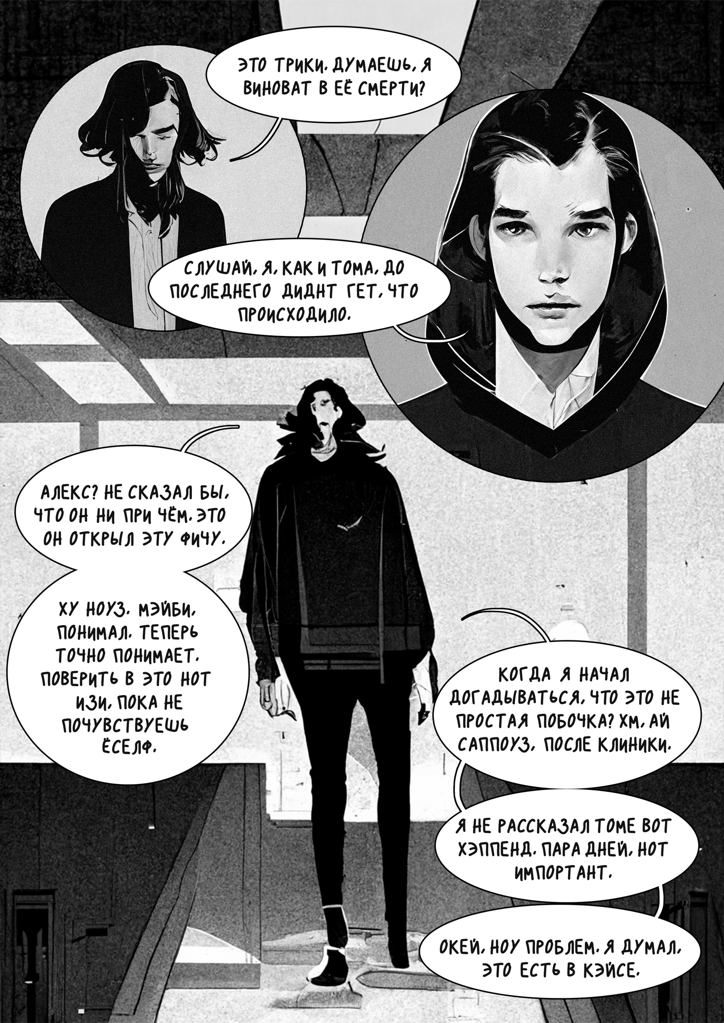 Мы пешком шли. Я предложил перед репой выпить по кофе. Поэтому мы и сели в парке. Тома взяла себе чёрный, ноу шугар. Я начал рассказывать, чем там занимаюсь, что мой обычный джоб – это мувы для геймдева. Для кино тоже иногда. Рассказываю и слышу, как тот саунд появляется. Похоже на гудение, но не то. Это даже звуком сложно назвать. Его как будто всё тело чувствует. Просто уши эспешалли. Вот понимаю, волна идёт, сейчас накроет. Потому что саунд нарастал, становился всё ближе и громче. Я сперва старался не обращать внимания, просто кип толкинг. Пока не стало так громко, что пришлось уши зажать руками. Звук похож был на какой-то множественный ритм. Как занавеска на ветру хлопает, только с эхом и сразу в разных направлениях. Вери лауд. Я зажал уши и вроде даже зажмурился. Потом открываю глаза, а Тома дисэпиред. Не сразу увидел её – она под деревья убежала. Я не понял зачем. Вообще забыл, что она тоже может воспринимать это… этот… В общем, этот звук. Только она видит его, а не слышит.