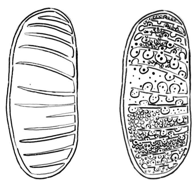 По строению различают два типа митохондрий: с пластинчатыми и тубуло-везикулярными кристами. С пластинчатыми кристами митохондрии представлены в тканях, где требуется больше синтеза энергии(слева). С тубуло-везикулярными кристами представлены в клетках надпочечников, синтезирующих стероидные гормоны(справа).