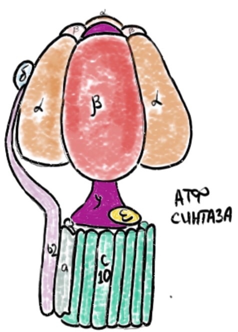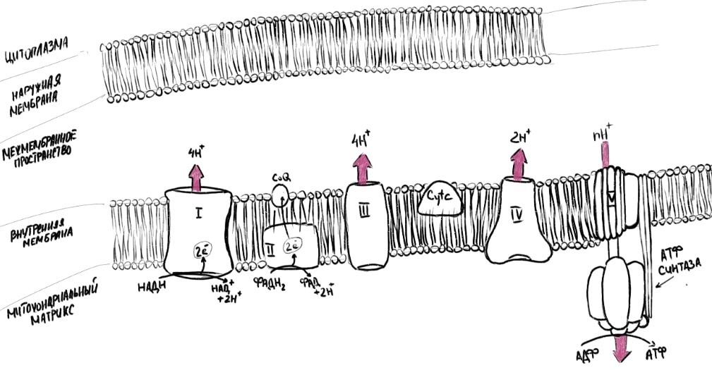 Перенос водорода происходит с конкретной целью. Они активно выкачиваются из внутренней мембраны наружу, создавая градиент концентрации водорода. Такой градиент обладает потенциальной энергией. Это можно сравнить тем как образуется молния. Эта потенциальная энергия воздействует на главный фермент дыхательной цепи – АТФ синтазу и она синтезирует энергию.
