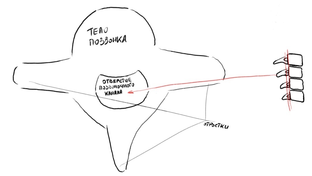 Теперь поговорим про единицы из которых формируется позвоночник – позвонки. Позвонок состоит из тела, дуги и отростков, к которым крепятся мышцы и связки спины. Дуга и тело позвонка образуют собой отверстие. Отверстия каждого позвонка в совокупности образуют позвоночный канал. Внутри этого канала располагается спинной мозг.