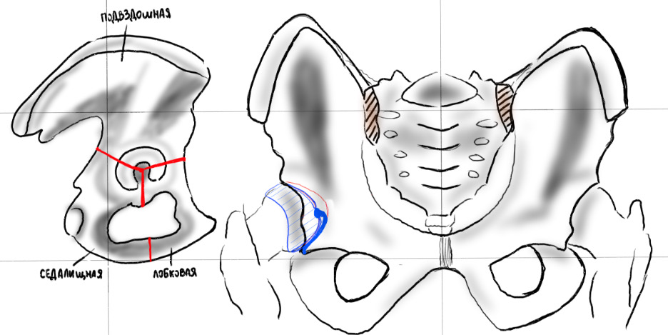 Тазовая кость. Тазовая кость образована тремя парными костями: лобковая, подвздошная и седалищная. Они объединяются хрящевой тканью в одно целое до 12-16 лет. После 16 лет все три парных кости представляют собой одну целую кость.