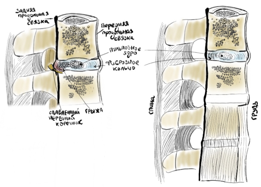В задней продольной связке в отличие от передней много болевых рецепторов. А именно там идет место выхода грыжи. Она давит на заднюю продольную связку и вызывает сильную боль. Мышцы, окружающие область повреждения рефлекторно сокращаются, стараясь защитить участок повреждения. Длительный спазм мышц приводит к усилению боли и запуску второго порочного круга, где доминирует боль.