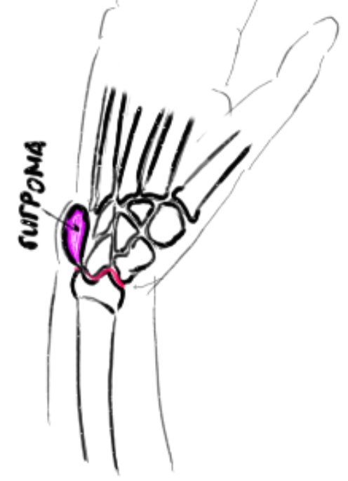 Еще один распространенный исход травмы – гигрома запястья. Гигрома – это доброкачественная опухоль. Бывает как наследственная расположенность к их образованию, так и случайное образование после травмы. Первопричиной является перерождение клеток соединительной ткани. Перерождению клеток ткани способствуют травмы, растяжения сухожилий и воспаление суставной капсулы.