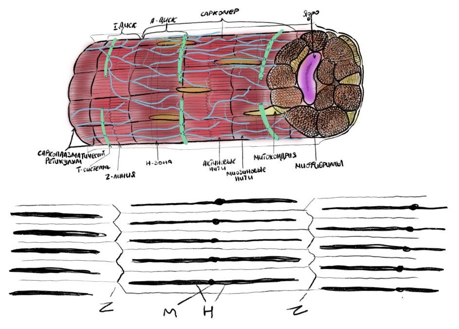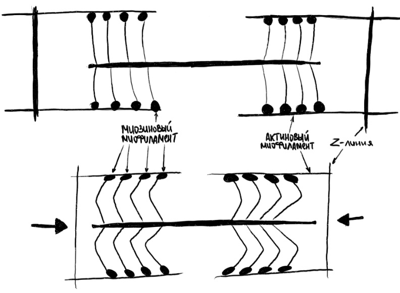 Миофибрилла состоит из элементов, способных сокращаться, продольно лежащих, скрепленных между собой цилиндров. Эти цилиндры называются саркомеры. Внутри такого цилиндра расположены комплексы актиновых и миозиновых нитей, которые при сокращении цепляются друг за друга и притягиваются.