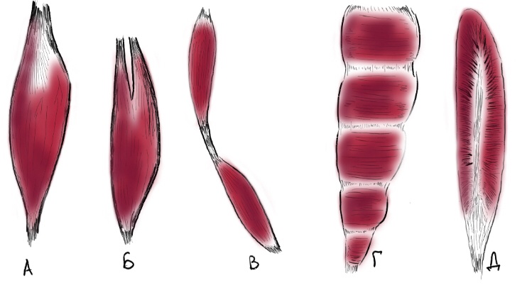 А – веретенообразная; Б – двуглавая; В – двубрюшная;