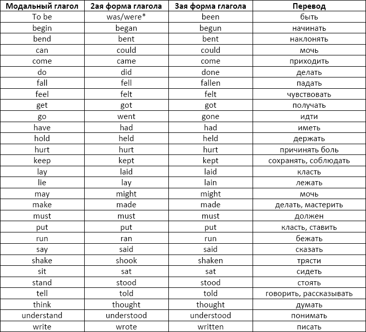 Учите не все сразу, а постепенно и они обязательно улягутся, мы же возьмём только некоторые из них, которые на данном этапе нам важны. Список неправильных глаголов можно найти на любом ресурсе сети интернет и абсолютно любом учебнике