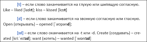 ПРАВИЛА произношения ГЛАГОЛ + ED:Глагол с окончанием – ED, а именно само окончание – ED может произноситься (читаться) по-разному – его могут передавать такие звуки как «т», «д», «ид» – [t]-[d]-[ɪd]