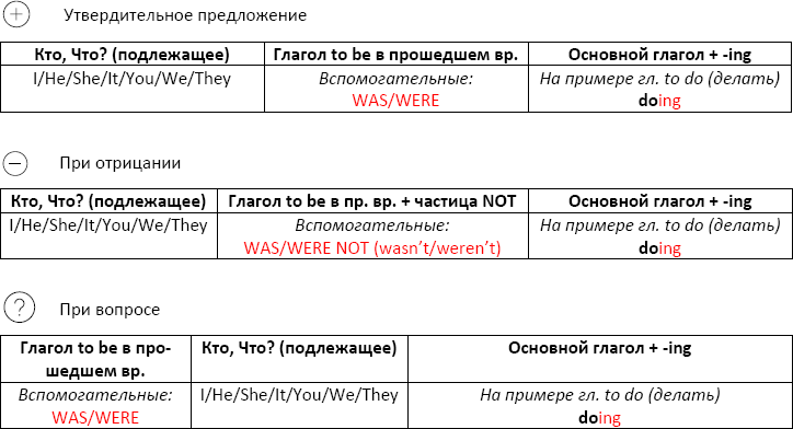 При отрицании добавляется частичка NOT между WAS/WERE и глаголом с окончанием – ING.