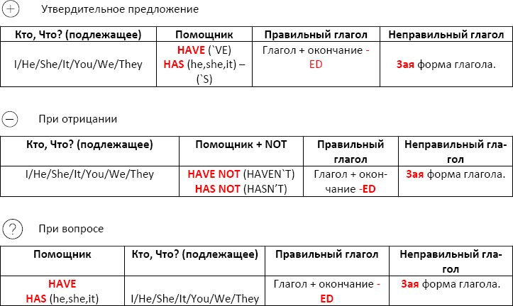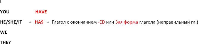 То есть, если мы проговорим словами: подлежащее плюс HAVE или HAS (has для he, she, it) + либо глагол с окончанием – ED, если он правильные, или 3ая форма глагола, если он неправильный.