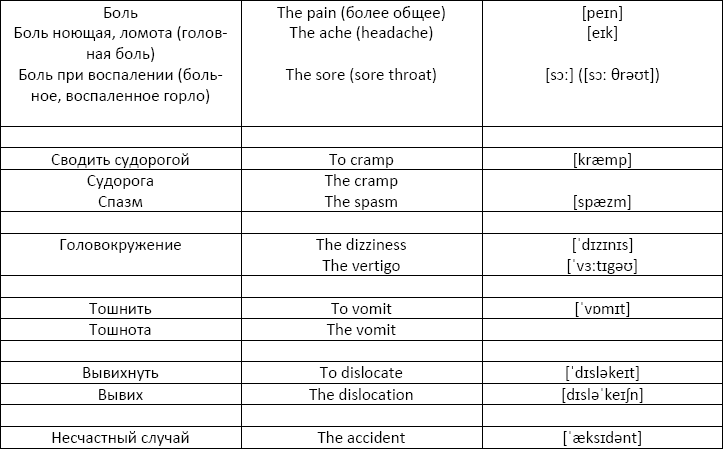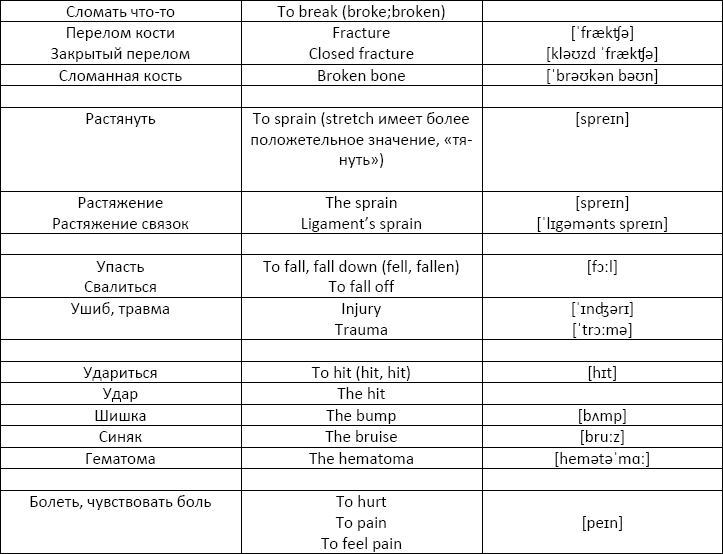 Словарный запас на тему: травмы и противопоказания