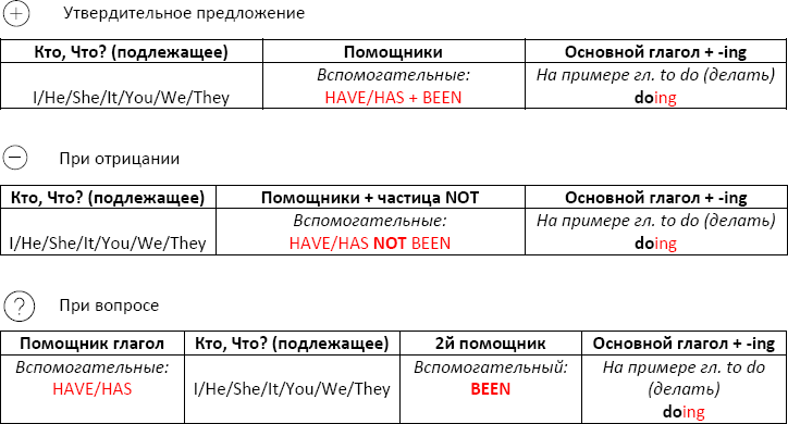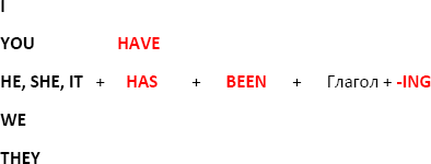 Для построения нам необходимо начать с подлежащего КТО, ЧТО? затем идет HAVE или HAS (для HE, SHE, IT) и затем основной глагол нашего действия с окончанием – ING.