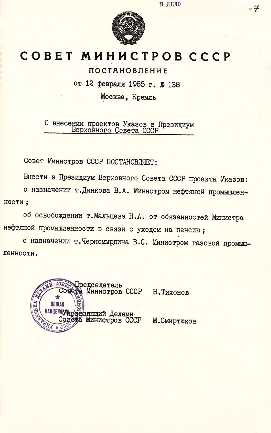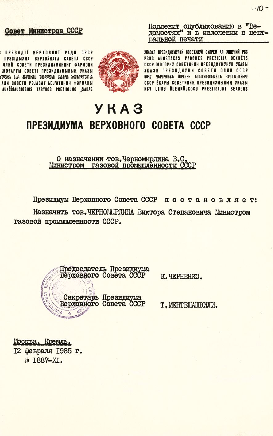 Постановление Совета министров СССР № 138 и Указ Президиума Верховного Совета СССР о назначении В. С. Черномырдина министром газовой промышленности от 12 февраля 1985 года
