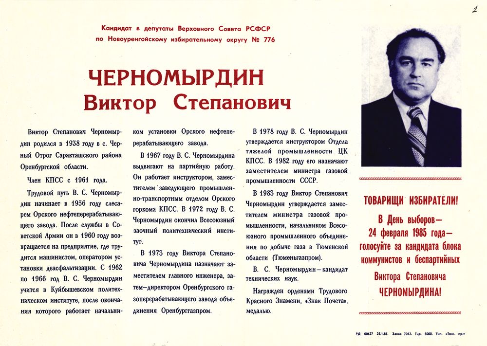 «Раз министр, значит – депутат, народный избранник!». Избирательная листовка о кандидате в депутаты ВС РСФСР В. С. Черномырдине и его благодарственная телеграмма коллективам выдвинувших его предприятий. 25 января 1985