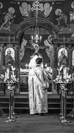 И на Святой литургии давайте сосредоточивать свой взгляд, снова говорит святой Серафим Саровский, на какой-нибудь иконе, или лампаде, или на священнике – не с целью сосредоточиться на священнике, а чтобы от него наша мысль переходила к священным помыслам и переживаниям в нашей душе.