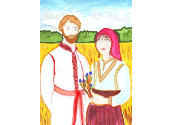 Как-то приключилось, что последнее поле, дальнее, не убранным осталось, рук не хватало. Урожай Бог богатый послал в тот год. Позвали тогда старейшины Рода на помощь всех, кто мог, даже из других родов и мест. Все соседи с радостью откликнулись, в назначенный срок собрались. Благословясь, жатву начали. Тут-то и увидал Андриан свою любимую. И она его узнала. Медлить молодец не стал. Как закончили работу, матери-отцу в пояс поклонился, просит сосватать девицу. Платок шёлковый расписной для неё у мастериц давно уж выменял. Велел передать да ответ прислать.