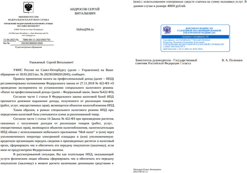 Поскольку спор вокруг данного вопроса не утихал, я решил задать задачу про 40 000 рублей регулятору (ФНС) и вот, что мне на это ответила налоговая: