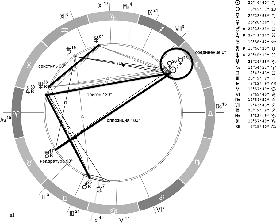 Представьте, что два парня подрались в школе, а учитель им говорит: «Пожмите руки и помиритесь». Как вы думаете, как они пожмут друг другу руки? В знак примирения или потому что обстоятельства так сложились? Не думаю, что ребята сразу после рукопожатия станут лучшими друзьями. Но плохой мир лучше хорошей войны. С аспектами планет то же самое. Есть аспекты «хорошего мира», когда взаимодействующие планеты дружат и их еще и примиряют, есть аспекты «плохого мира», когда взаимодействующие планеты не дружат, но между ними есть примиряющий аспект. Такие аспекты называются гармоничными – тригон и секстиль – здесь взаимодействие планет примиряет. Тригон (трин) 120° – это обнимашки, не просто пожать руку, но и еще похлопать по плечу/обнять/заключить договор. Секстиль 60° – это кивок головы или «помахать ручкой». Аспект квадратуры (квадрат) 90° и оппозиции 180° – это война. Но какая война? Хорошая или плохая? Хорошая война – квадрат между дружественными планетами. Плохая война – квадрат между недружественными и любая оппозиция. Квадратура – это аспект напряжения, а оппозиция – всегда аспект войны. Поэтому даже дружественные планеты не договорятся. Поэтому оппозицию избегайте вообще (=не начинайте дела, когда есть оппозиция у планеты-сигнификатора[7]). Есть еще аспект соединения 0°, когда планеты обнимаются, и он напрямую зависит от дружбы и вражды планет. Если планеты враждуют, то в объятиях могут задушить друг друга. Если планеты дружат, то такие объятия будут самыми теплыми и нежными.