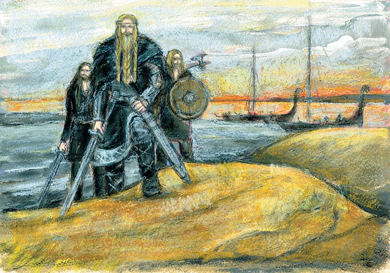 Тогда рассердилась Ладога и рассвирепела. Ещё никогда не доводилось видеть пенителям моря таких волн на хребтах морей и океанов, а видели они их много. Братья Ладоги – ветры свирепые – разорвали в клочья паруса, забросали пеной глаза кормчих, порвали снасти и якорные канаты. Изломала Ладога в щепу рули и весла, и забросила в бешенстве корабли к своему противоположному берегу. Только тогда она затихла и заснула, как ни в чём не бывало. Так оказались викинги в наших краях, там, где река Олонка впадает в Ладожское озеро. Вытащили они корабли на желтый песок у самого устья и три дня чинили их, восхваляя доброту Одина и милость Тора[244], что услышали их мольбу, спасли их жизни. А дальше вот что случилось.