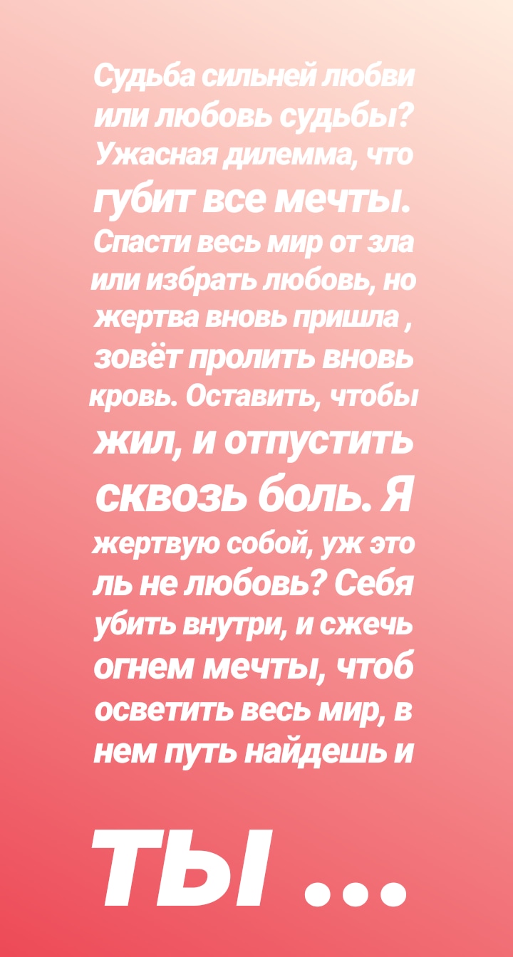 – Клео, что ты натворил.... Уже поздно. Я уже изменила этот мир. Ты так и не понял , что есть нечто большее , чем мы – это Вселенная и ее предназначение. А нас и правда преследует судьба. Но ещё не поздно все изменить. Встретимся в другой жизни , Клео . – с этими словами Тэсса закрыла глаза и ее сердце перестало биться .