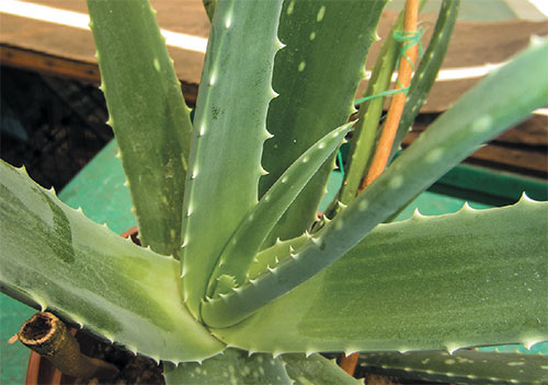 Листья сочные, мечевидные, сидячие, очередные, зеленовато-сизые, мясистые, с шипами. Лист со студенистой, прозрачной пульпой, окруженной желтой жидкостью или соком, с кожицей.