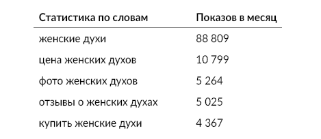 Далее определяются дополнительные параметры и слова, которые важны для пользователей. Для этого необходимо проанализировать хвост низкочастотных запросов, который возникает при проверке основного запроса. Например, вот что мы видим при проверке в сервисе Яндекс. Wordstat[24] категории «женские духи»: