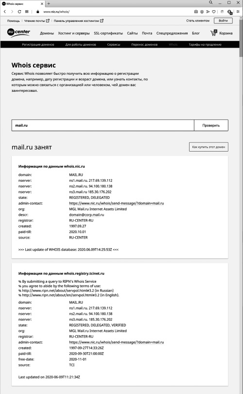 Рис. 1. Данные WHOIS-сервиса для домена mail.ru, представленные на странице https://www.nic.ru/whois/