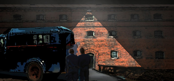 Очутившись на земле, я увидел трёхэтажное здание. Большую часть здания скрывала от взора ночная мгла. Освещена была лишь часть стены над входом. Свет падал сверху, из-под крыши, где был установлен прожектор. Свет прожектора выхватывал из ночной темноты несколько окошек с крепкими железными решётками и часть стены из потемневшего от времени красного кирпича.